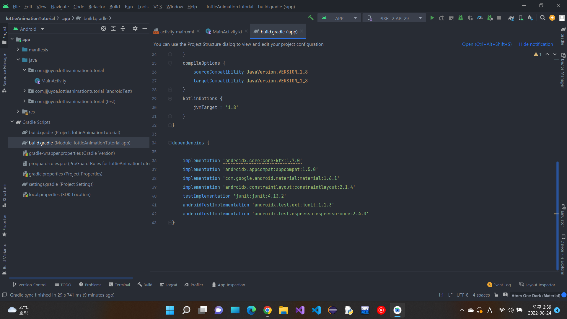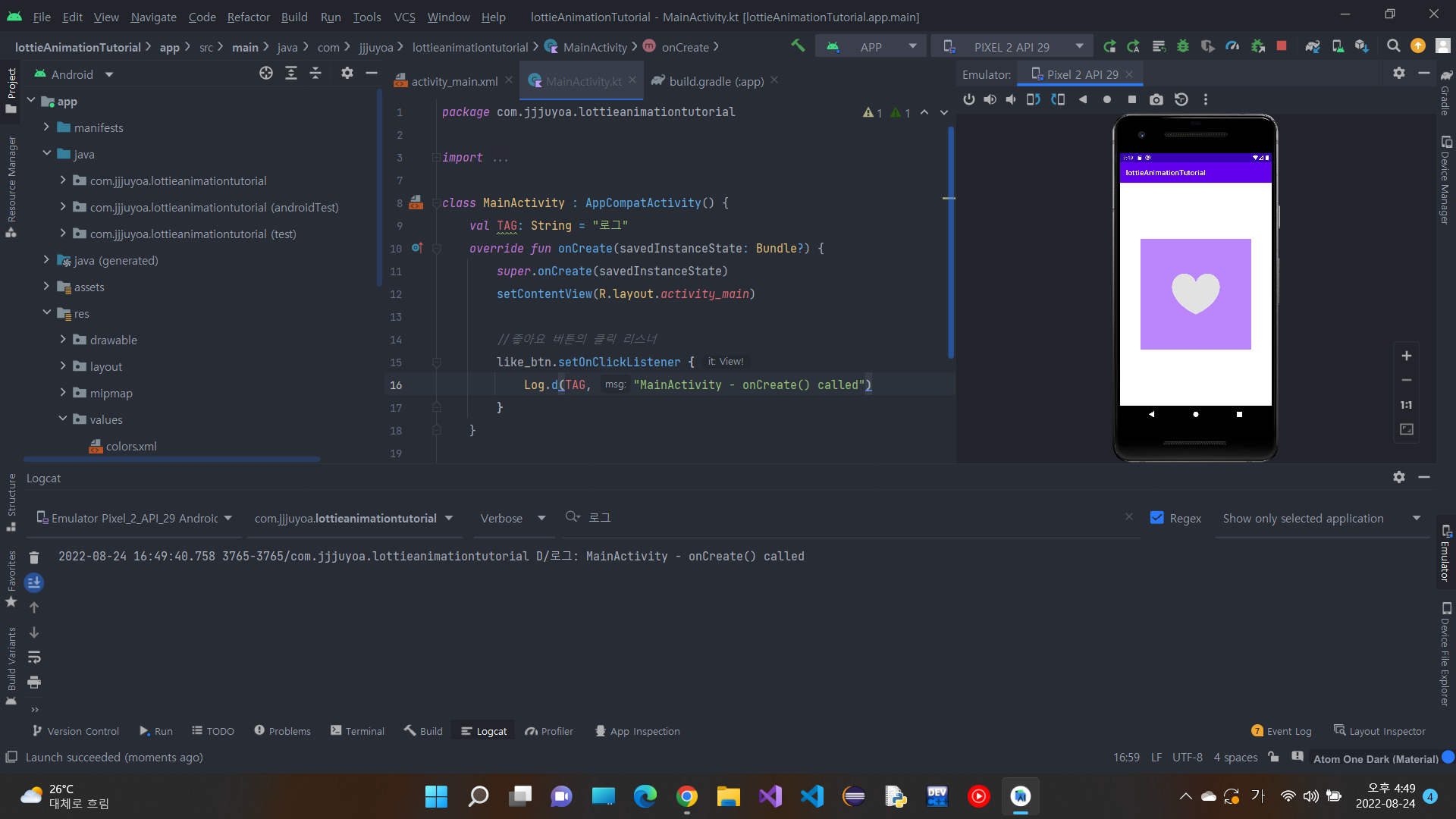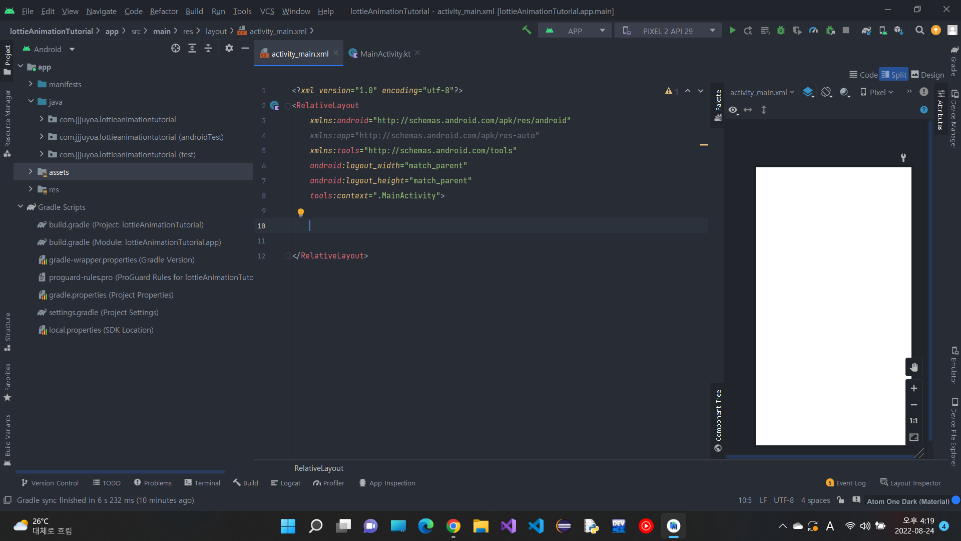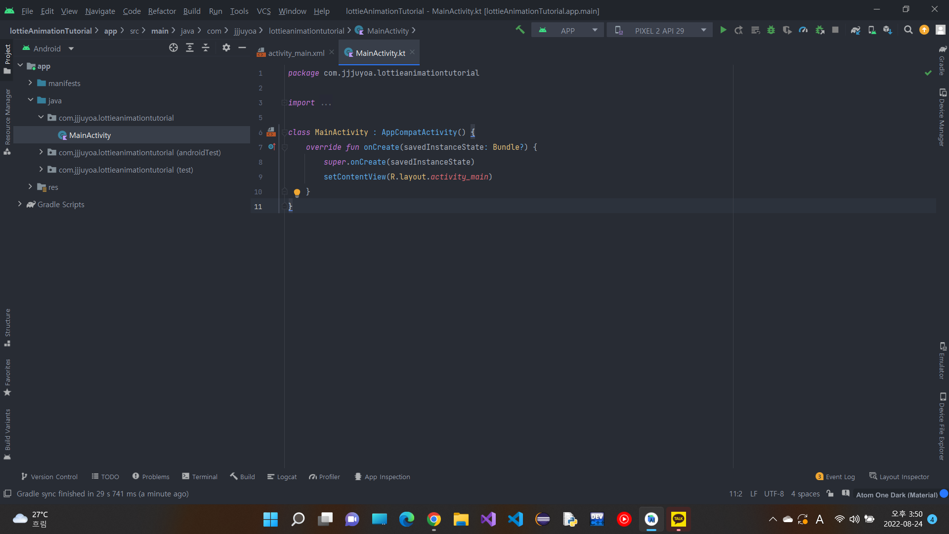 empty activity로 lottieAnimationTutorial이라는 이름의 프로젝트를 만들었습니다.