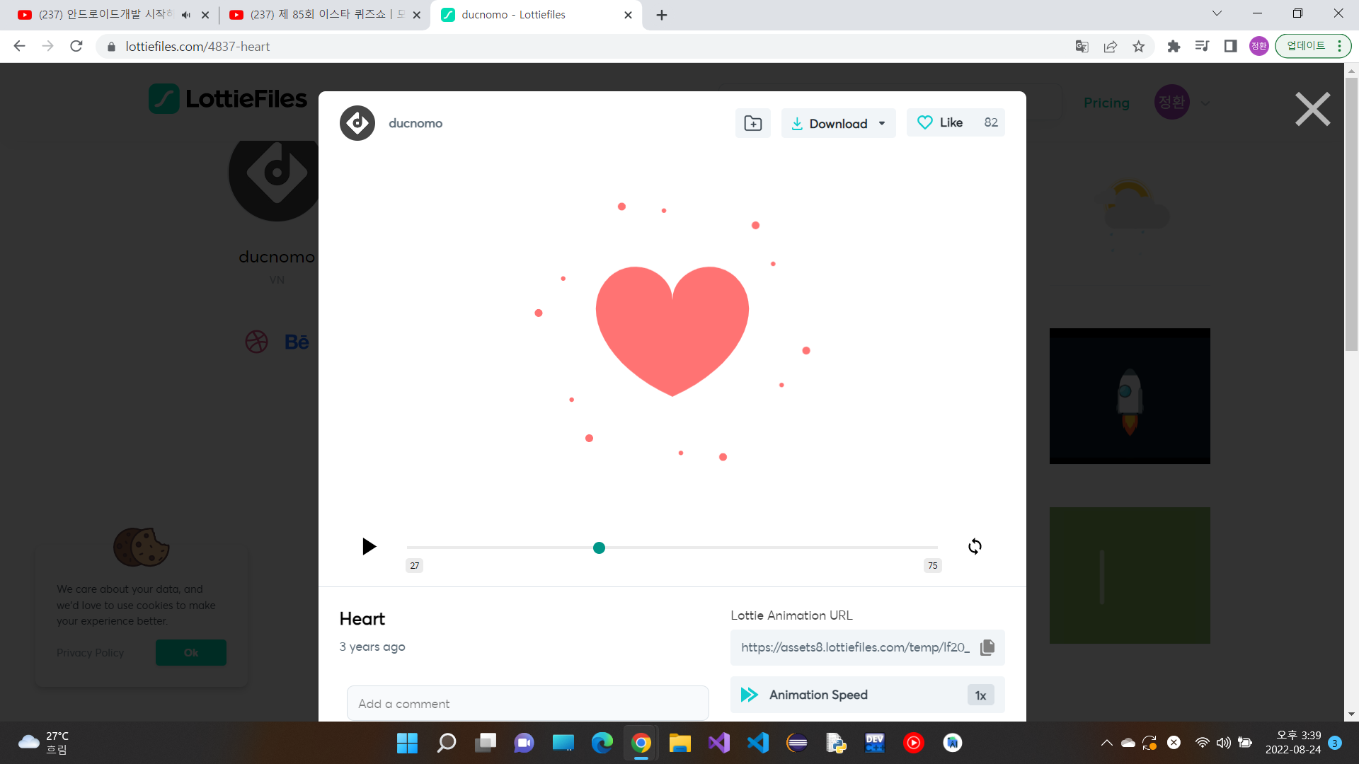 이렇게 로티 애니메이션으로 만든 좋아요 버튼이 잘 켜지고 꺼지는걸 볼 수 있습니다!!