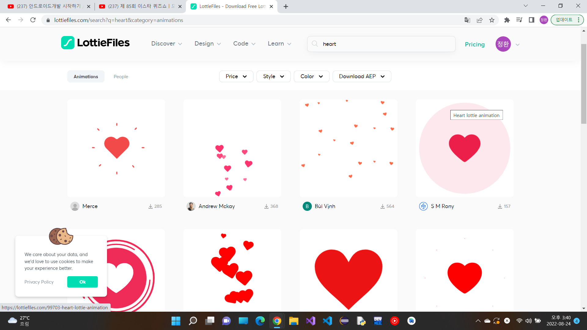 우선 로티파일스에서 하트를 검색해봅시다. 굳이 하트가 아니더라도 원하는 애니메이션을 선택하시면 됩니다.