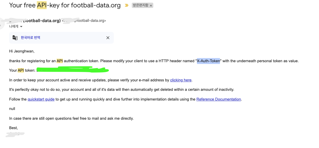 발급받은 토큰은 football-data 사이트에서 로그인을 할때 사용되며 모든 API 통신에 Header에 넣어 사용해야합니다.