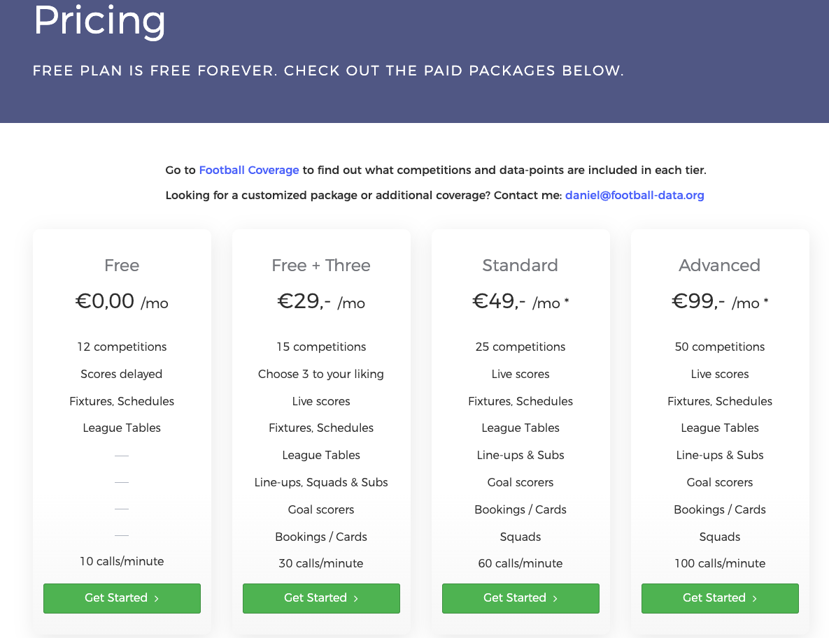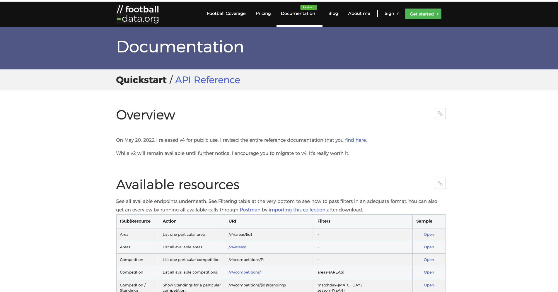 Purpose of the project football-data.org provides football data and statistics (live scores, fixtures, tables, squads, lineups/subs, etc.) in a machine-readable way. I won't announce how awesome football-data is, you're welcome to find out by yourself (or