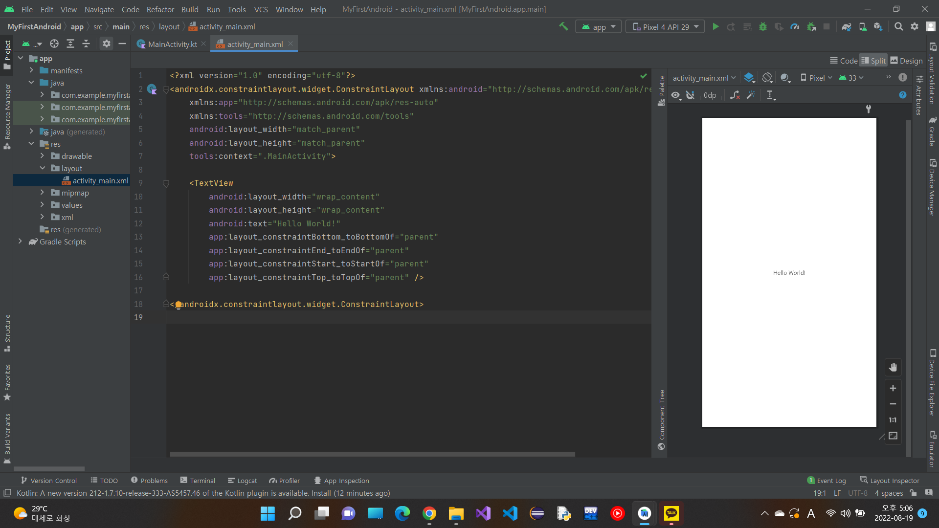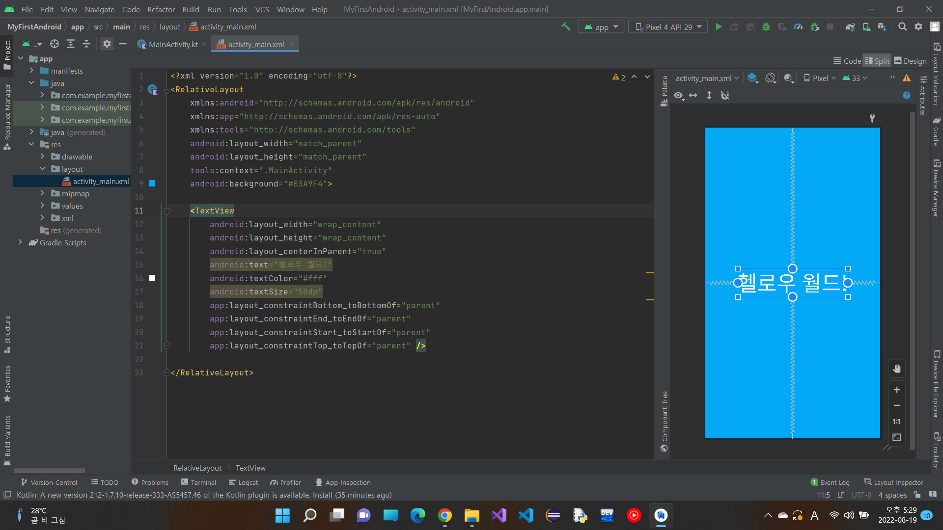 activity_main.xml를 볼 수 있다.(우리가 제일 많이 보게 될 친구)