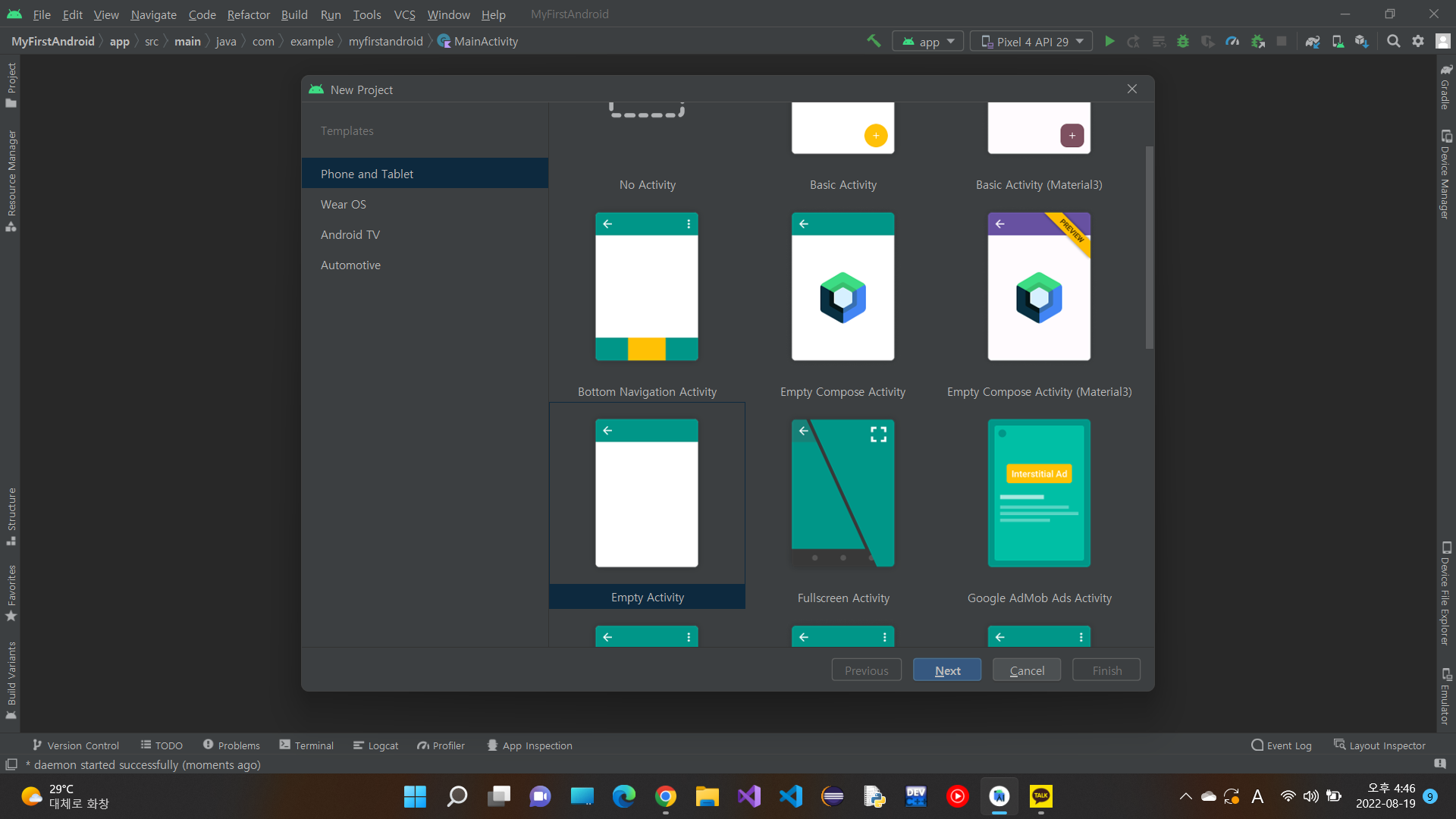 우선 empty activity를 고르고 프로젝트 이름을 정하면 끝! 나는 MyFirstAndroid로 정했다.
