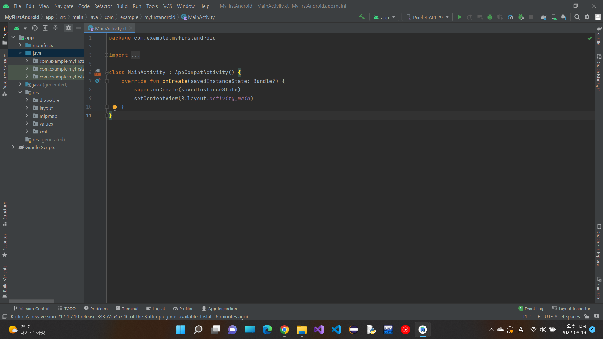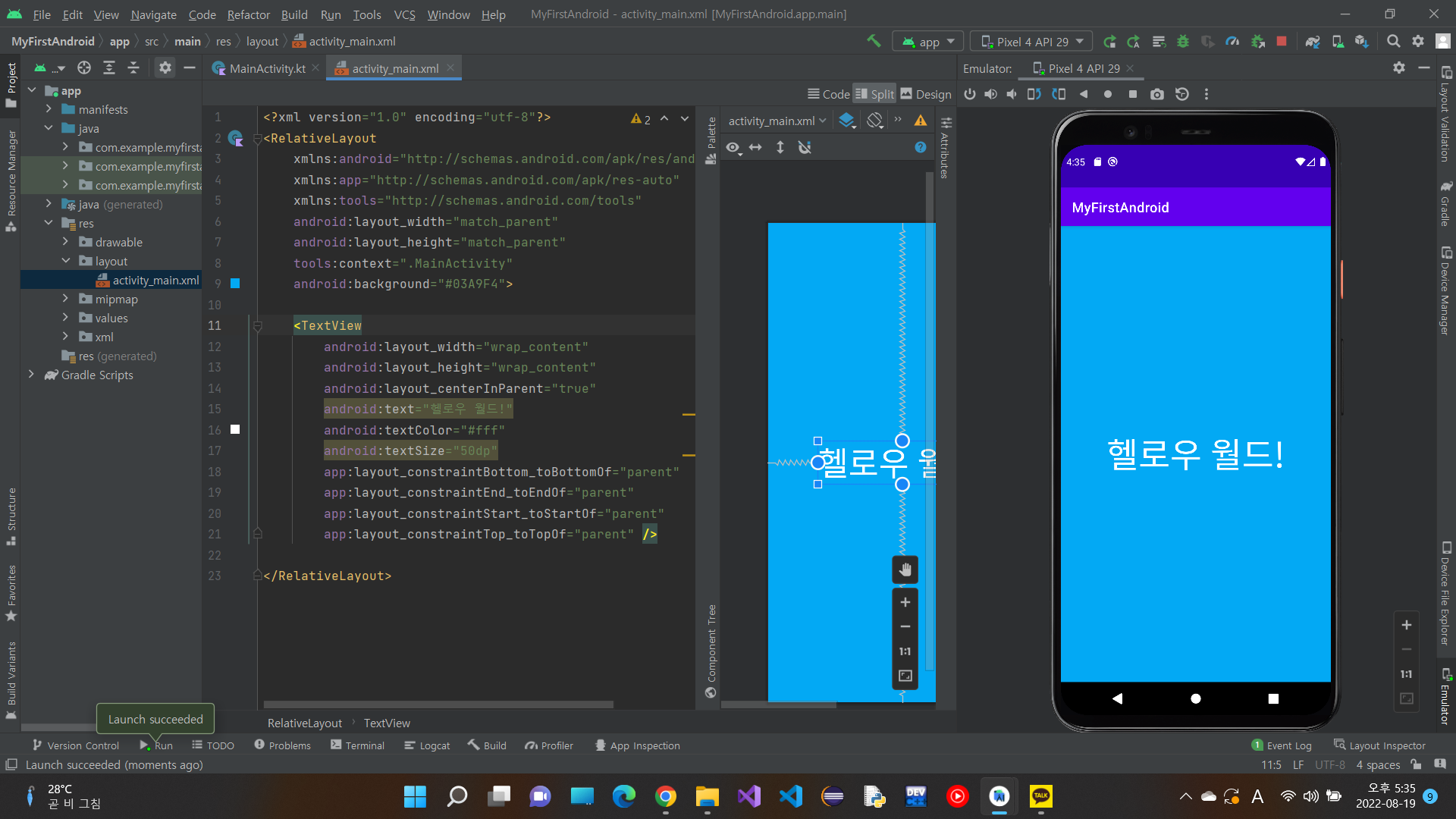 우리는 empty activity를 골랐으니 특별한 기능은 없고 그냥 기본 화면에 Hello world! 만 쓰여져 있다.